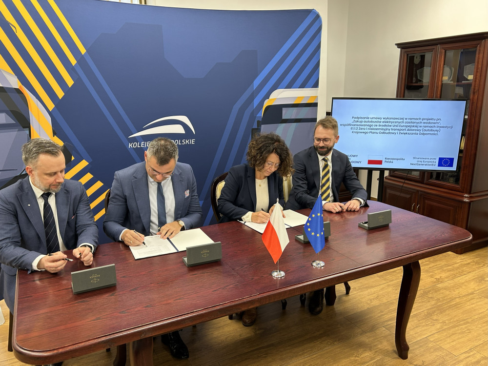 Dziś w siedzibie naszej spółki, podpisaliśmy umowę wykonawczą z Daimler Buses Polska sp. z o.o. na dostawę pięciu zeroemisyjnych autobusów elektrycznych zasilanych wodorem w ramach projektu pn. „Zakup autobusów elektrycznych zasilanych wodorem”, współfinansowanego ze środków Unii Europejskiej w ramach inwestycji E1.1.2 Zero i niskoemisyjny transport zbiorowy (autobusy) Krajowego Planu Odbudowy i Zwiększania Odporności