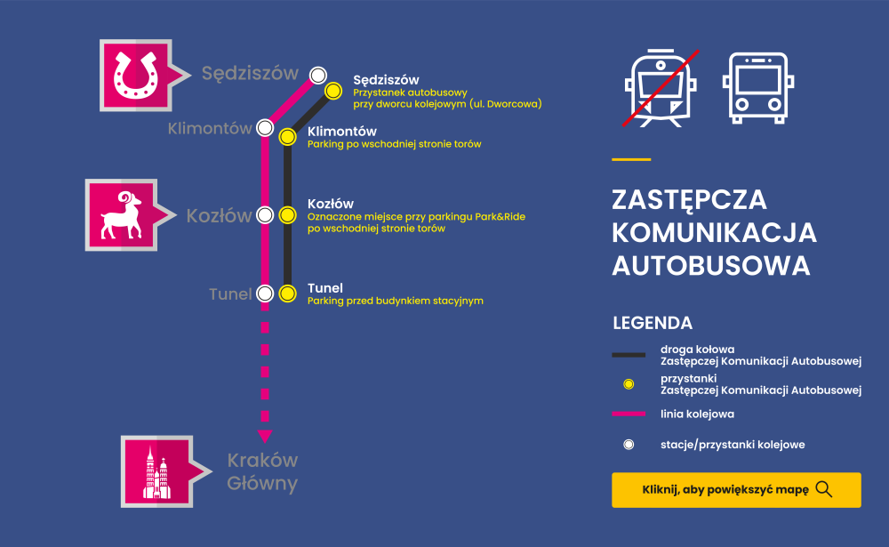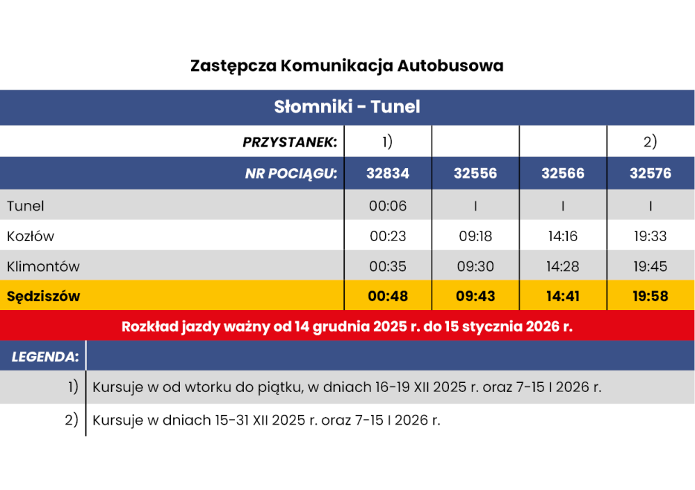 -> w dniach od 14 grudnia 2025 r. do 15 stycznia 2026 r. na trasie SKA2 na odcinku Sędziszów - Tunel