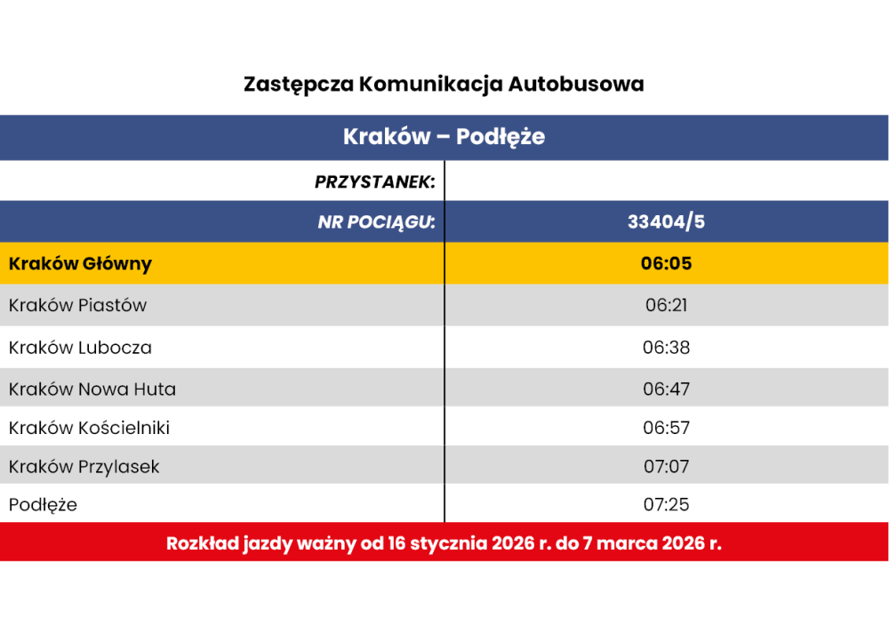 -> w dniach od 16 stycznia 2026 r. do 7 marca 2026 r. na trasie SKA2 na odcinku Kraków Główny - Podłęże
