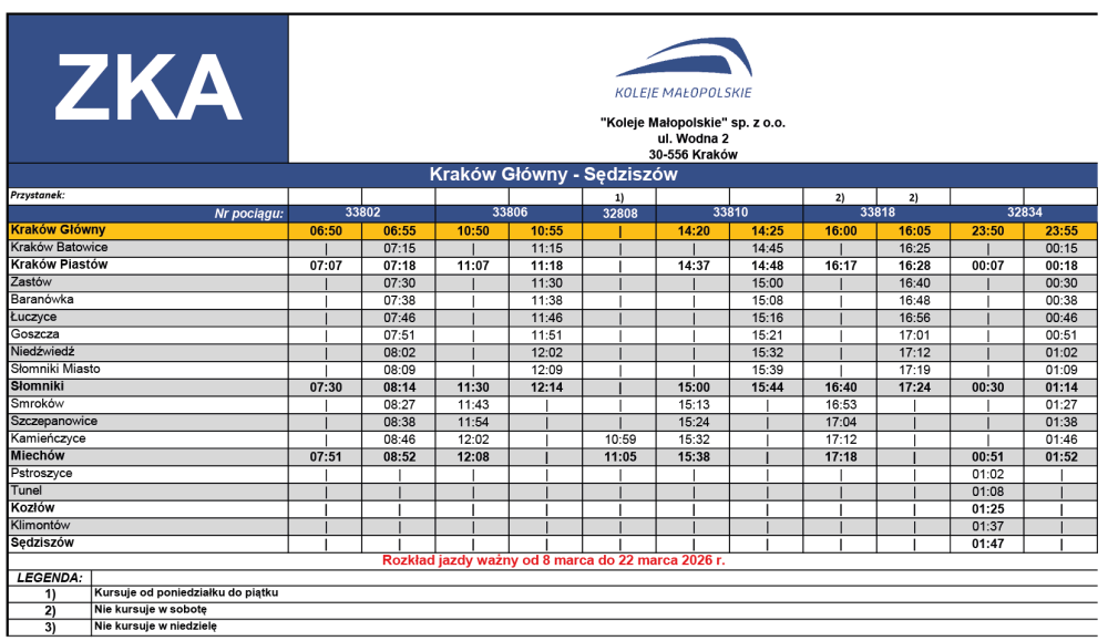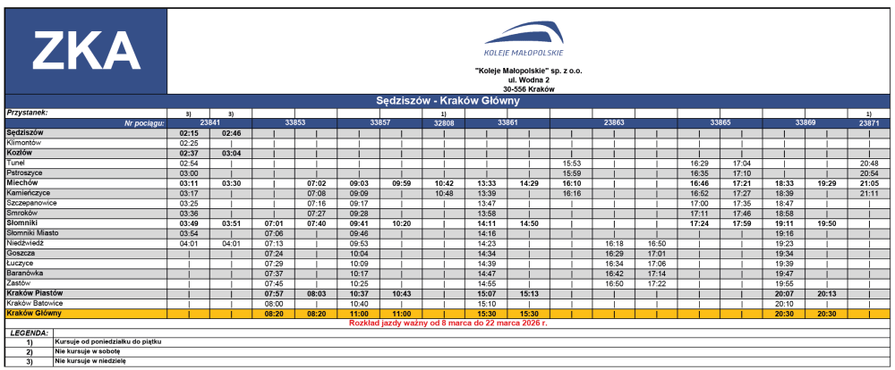 1. Przejazdy ZKA odbywają się w ramach zastępstwa za wybrane pociągi uruchamiane przez Koleje Małopolskie sp. z o.o.
