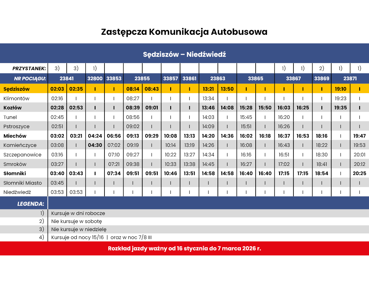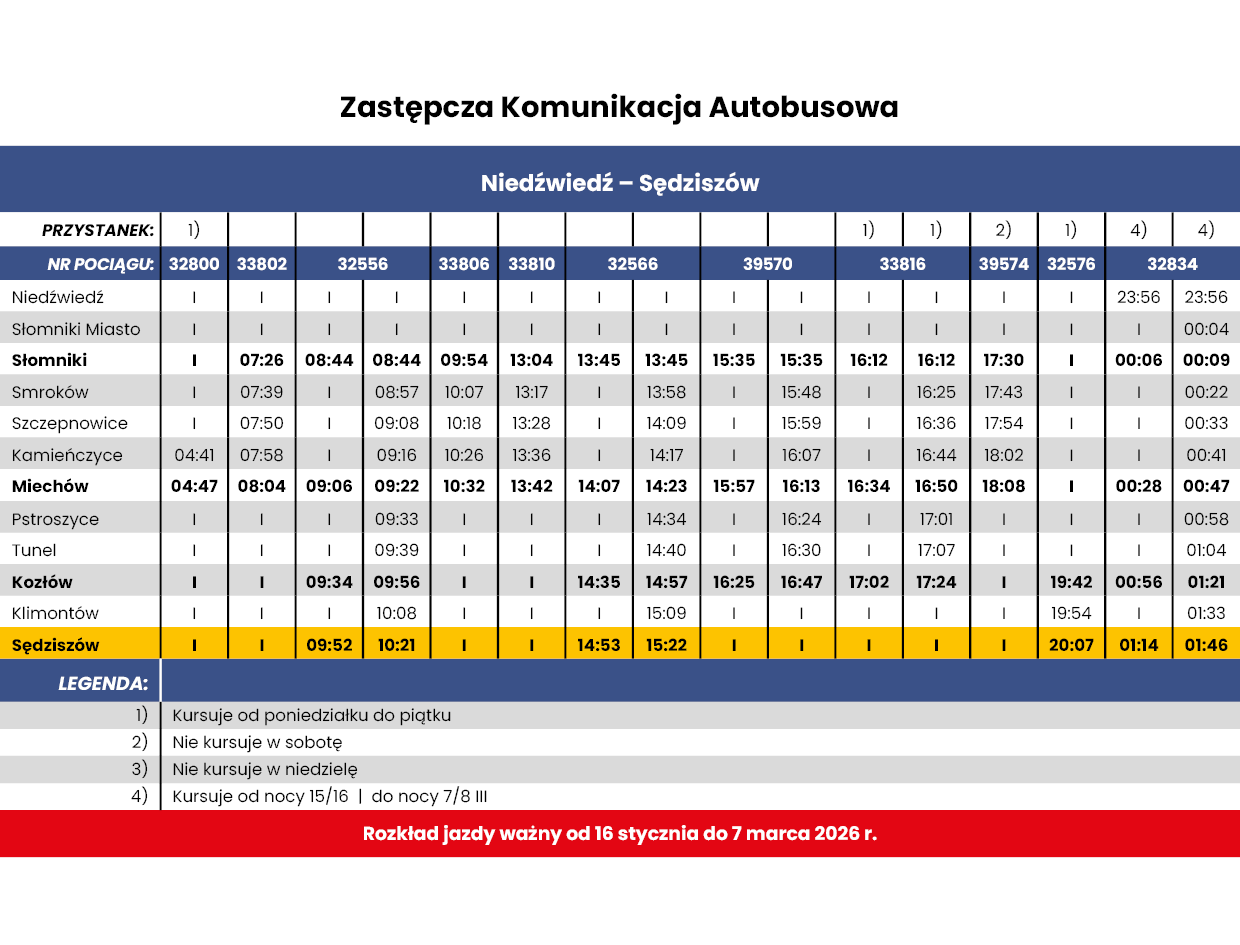 -> w dniach od 16 stycznia 2026 r. do 7 marca 2026 r. na trasie SKA2 na odcinku Sędziszów - Niedźwiedź